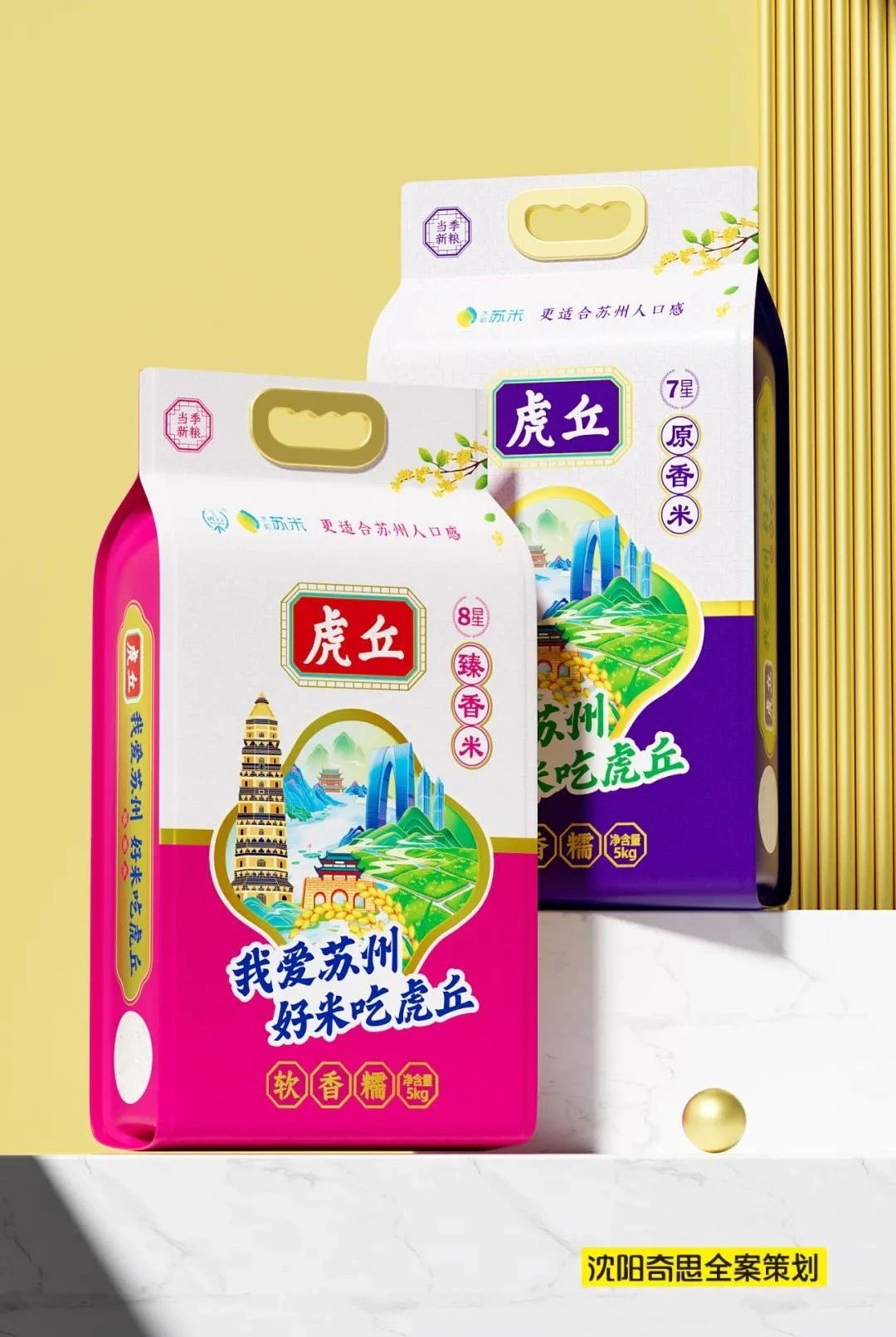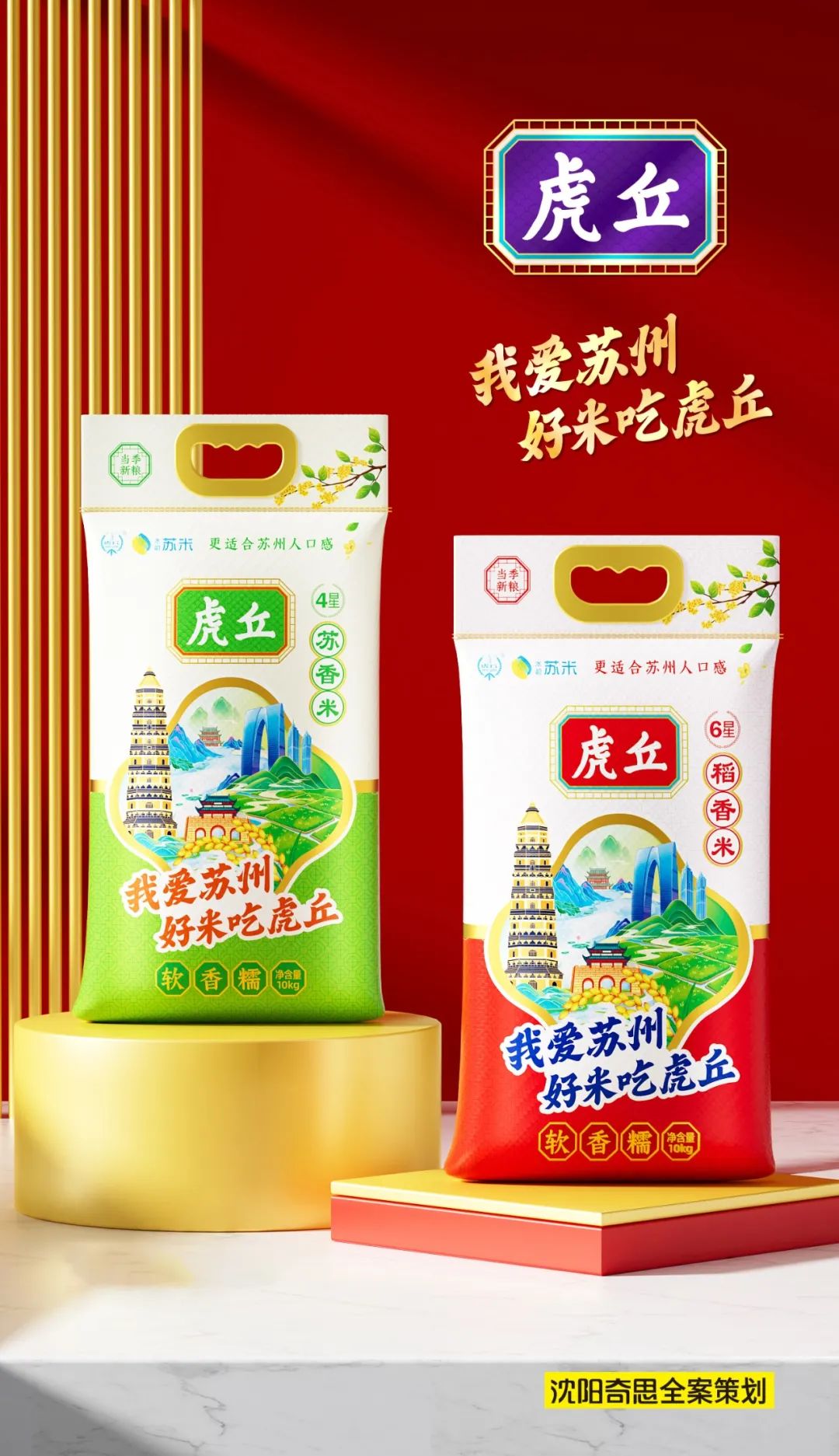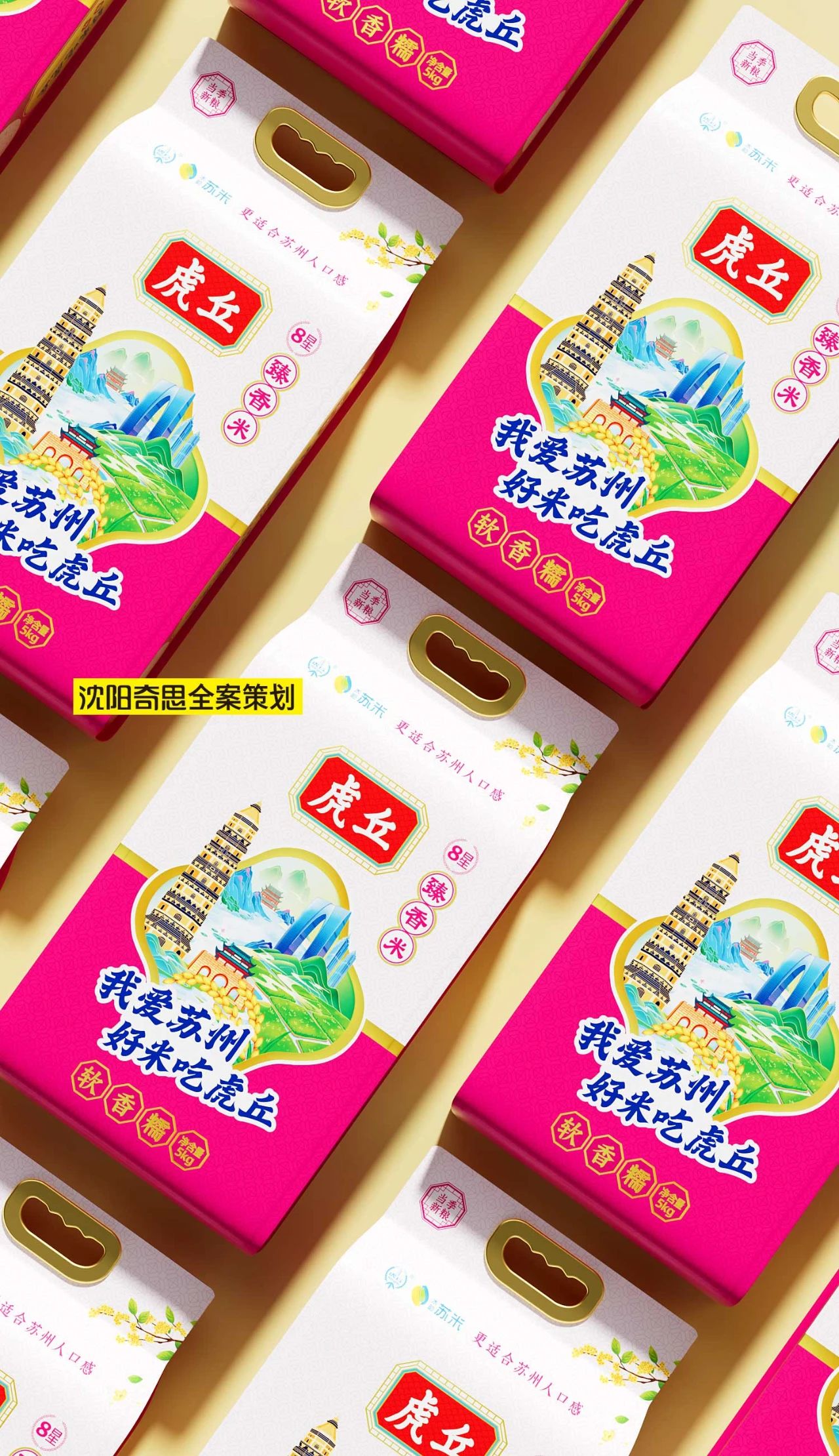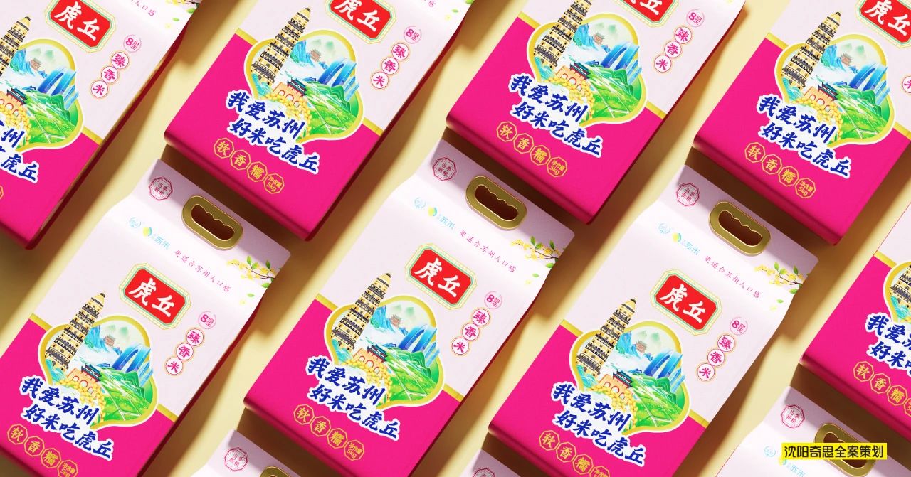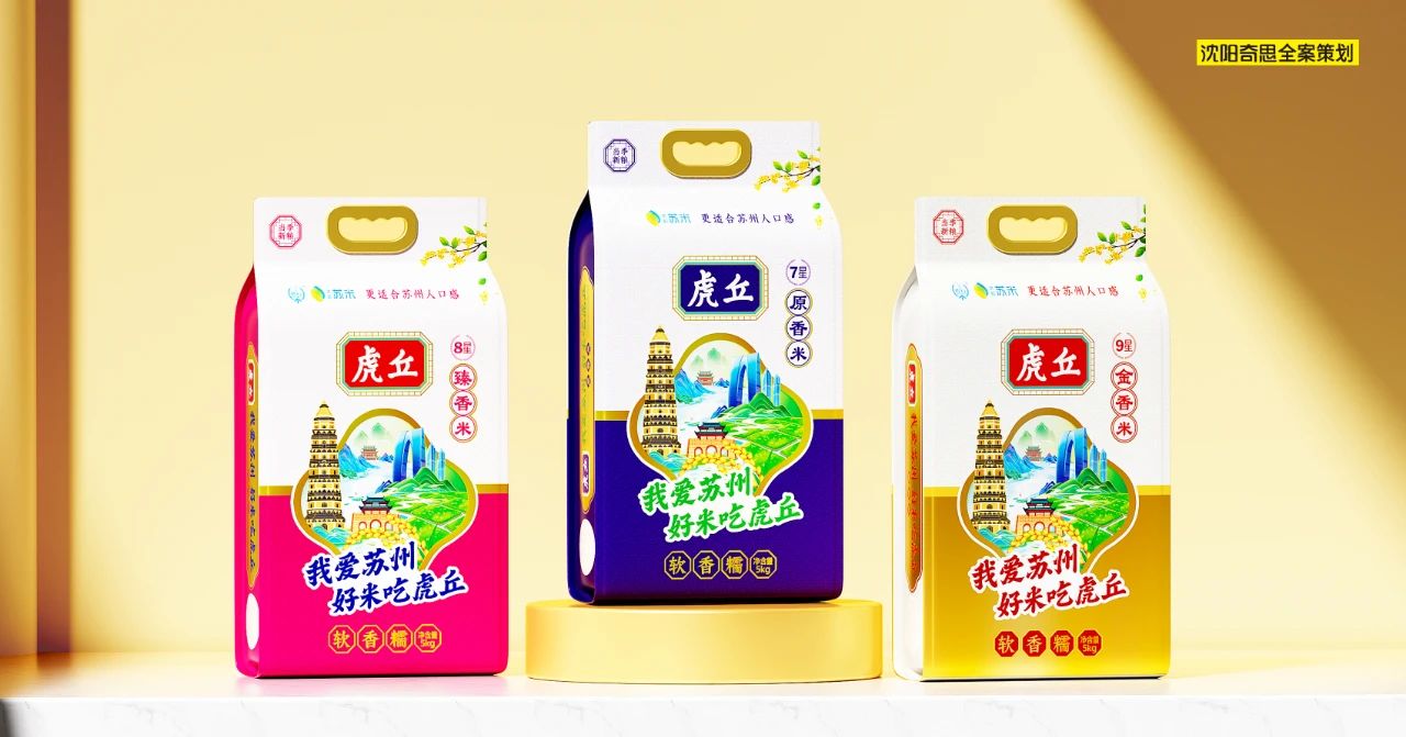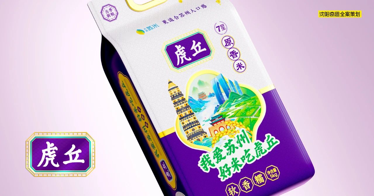 視覺(jué)記憶點(diǎn),我們將“我愛(ài)蘇州,好米吃虎丘”的口號(hào)一以貫之。將蘇州地標(biāo)性建筑與稻田、稻穗進(jìn)行融合,創(chuàng)建出虎丘的視覺(jué)核心記憶點(diǎn)。